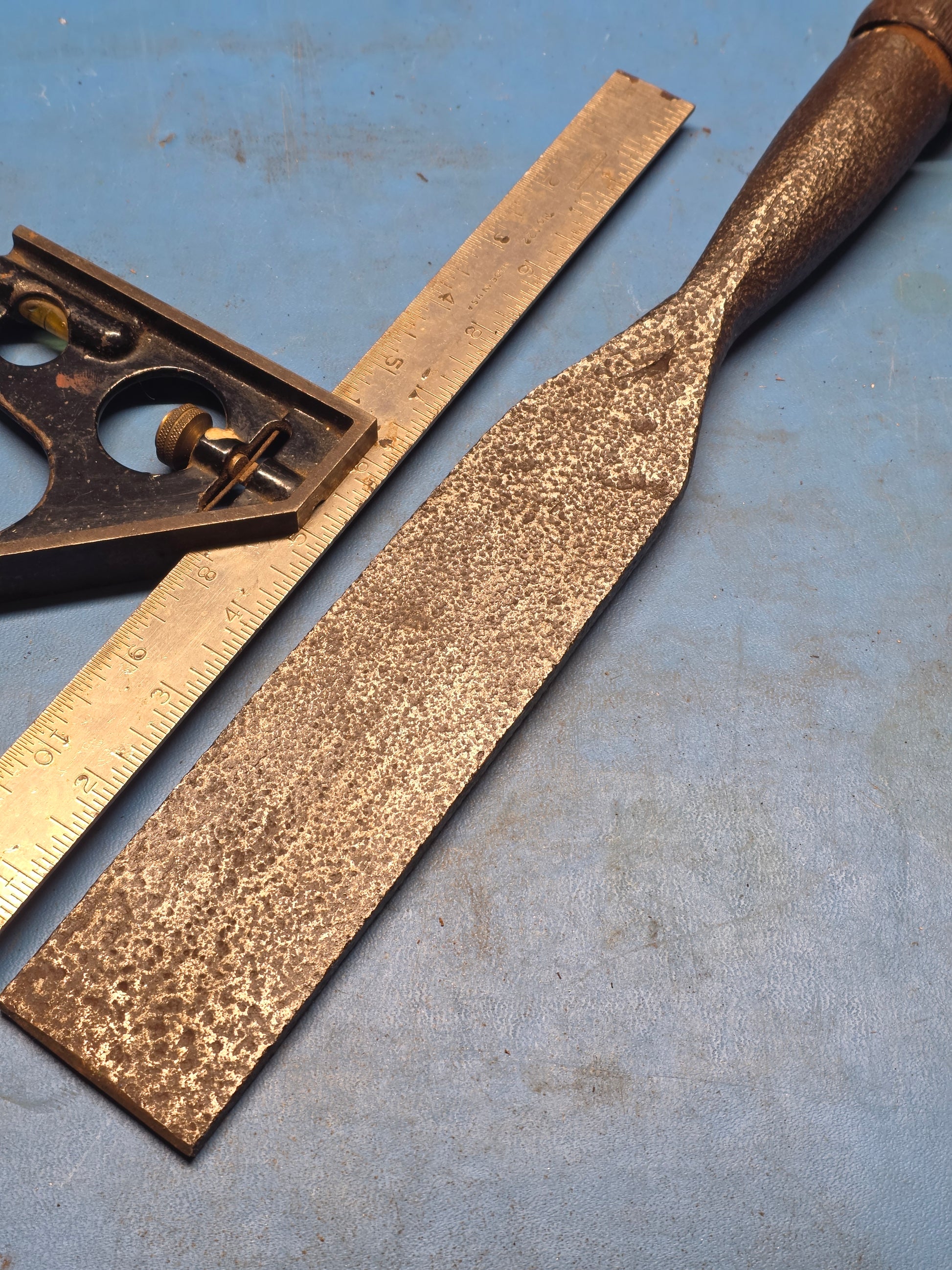 Definitely not a show piece. Early made 2" slick with handle. Has obvious pitting and is marked. Needs a new edge.