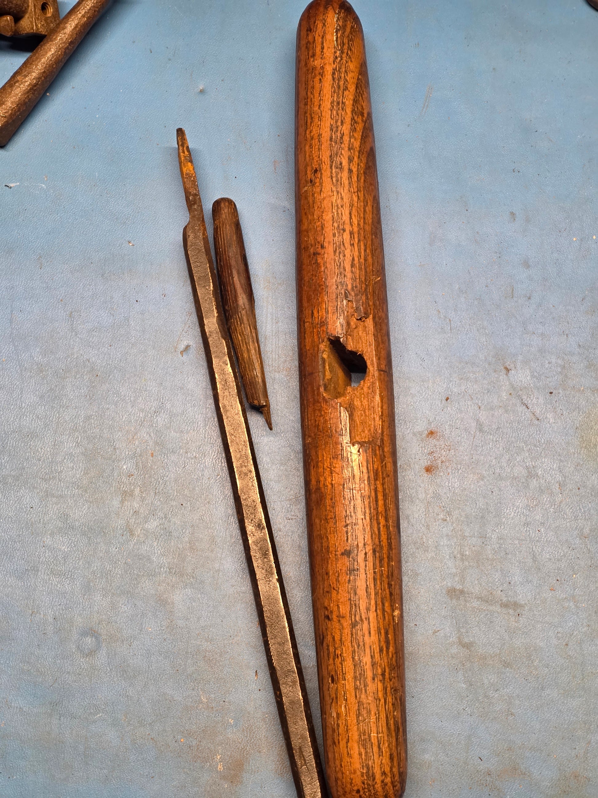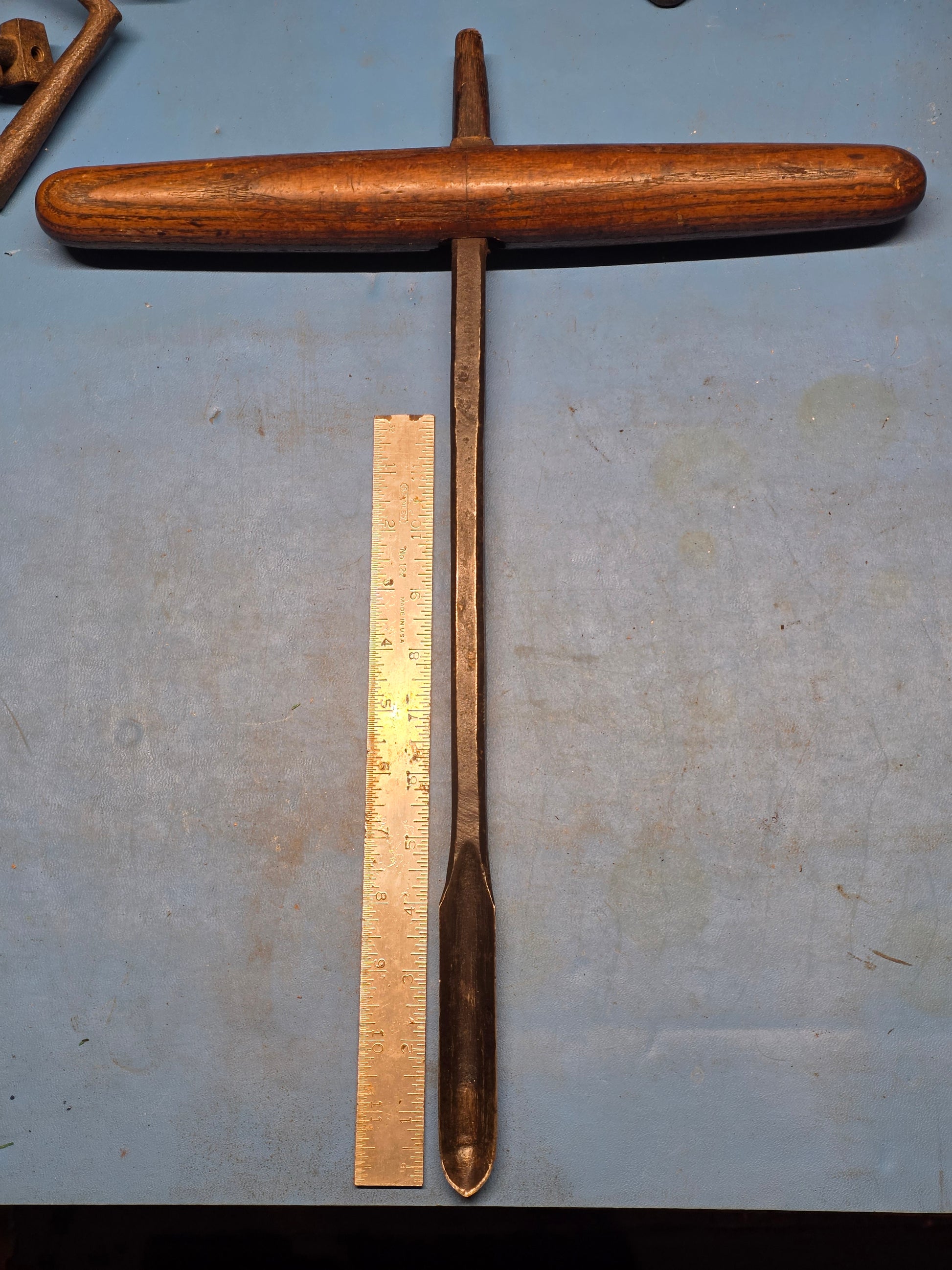Early spoon bit auger. Nice T handle design in good condition overall. Has a unique design to fasten the handle. Measures about 7/8" in diameter.