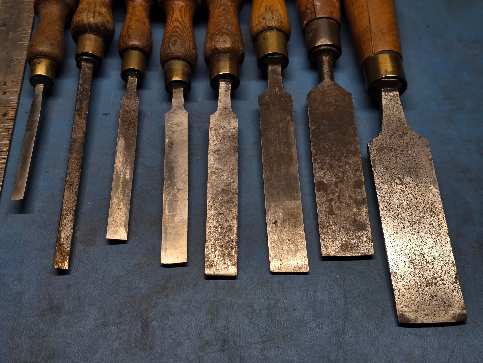 All are marked Marples and measure between 1/4"-1-1/4". Nice set of usable chisels. Fairly clean steel, some handles are better than others. Quick cleaning and sharpening and they will be ready.