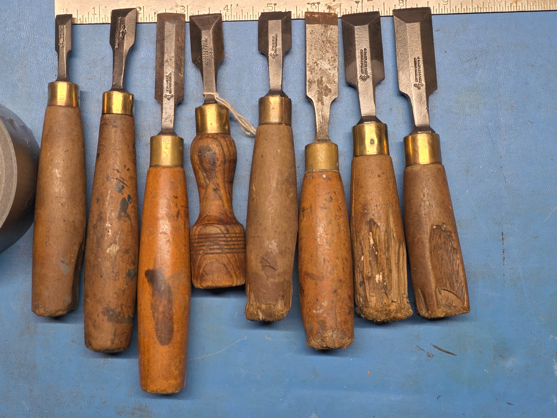 All are marked Marple. 7 bevel edges and 1 firmer chisel. Nice set of usable dovetail bevel edge chisels. Fairly clean steel with light pitting. Shortys and some handles are better than others. Quick cleaning and sharpening and they will be ready. Some consider these butt chisels.