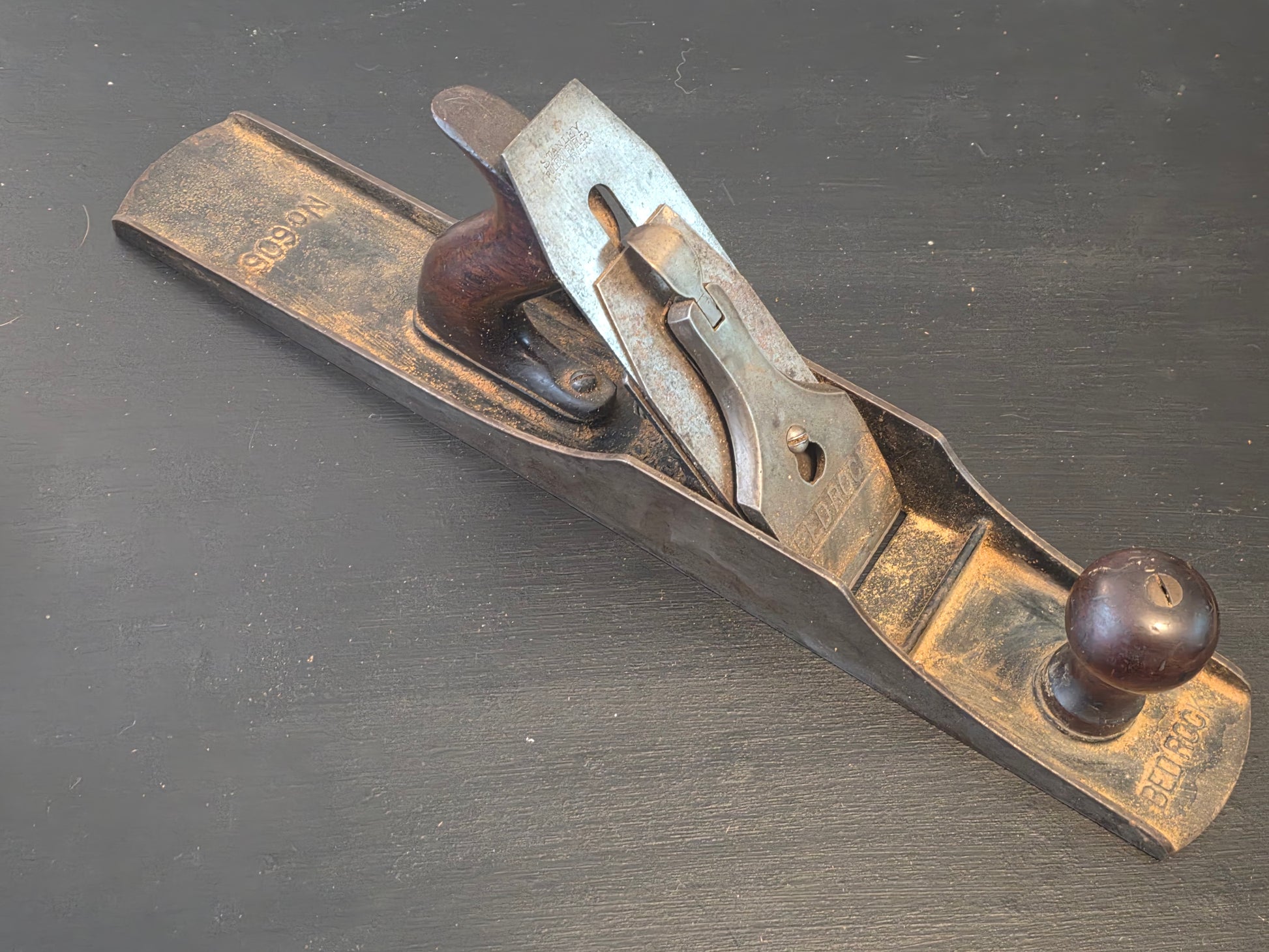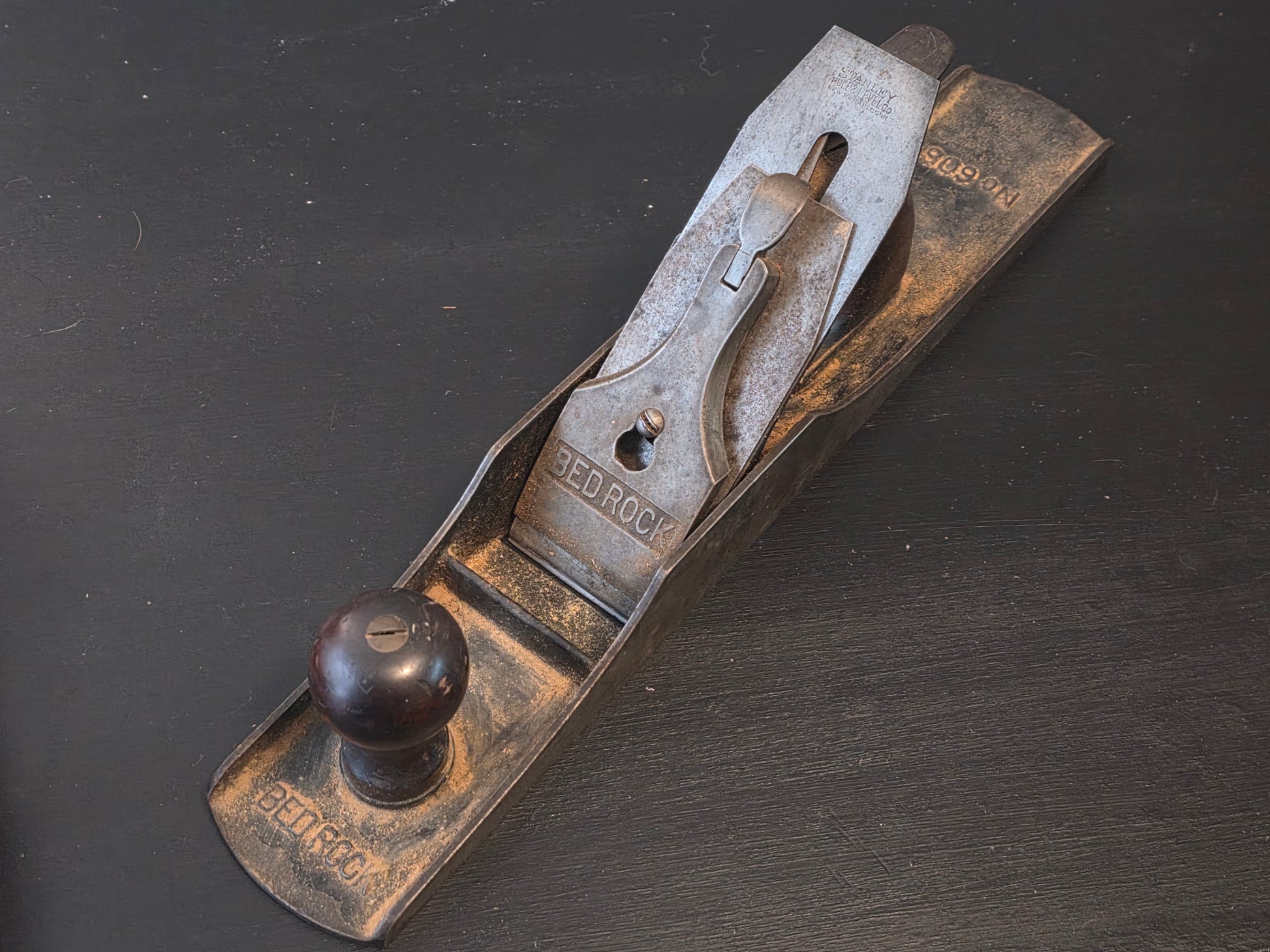 Nice Bedrock 606 smooth flat side. Needs a light cleaning but everything is in good condition. Wood is in very nice condition. The sole is good but needs some cleaning. Looks like the cap may have slight enlargement around the lower section of the keyhole.