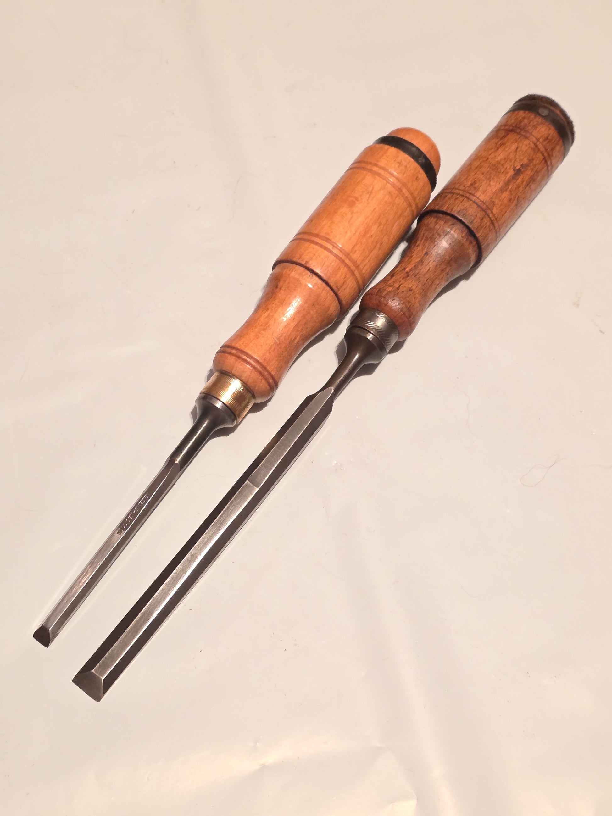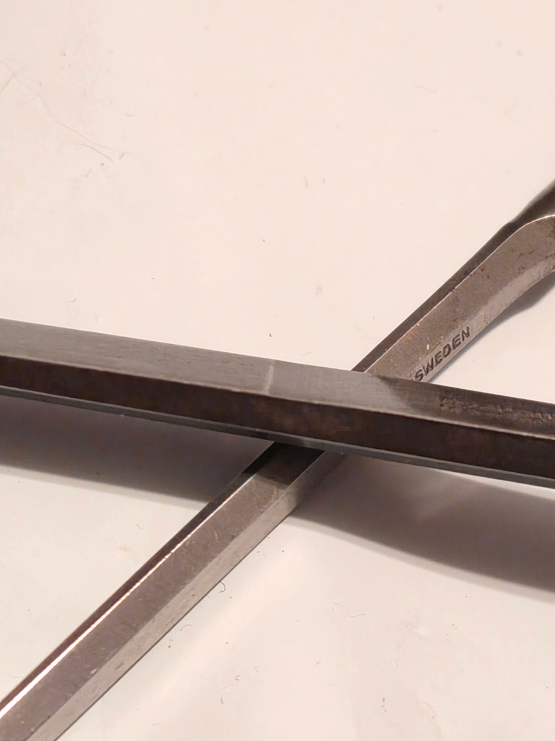 2 bevel edge sweedish bevel edge chisels. One is marked ESKILTUNA (E A BERG I BELIEVE) one is marked Soliden Sweeden. Smaller is a 1/4" the larger is a 3/8". The 3/8" is not cracked as shown. That is the way it was made.