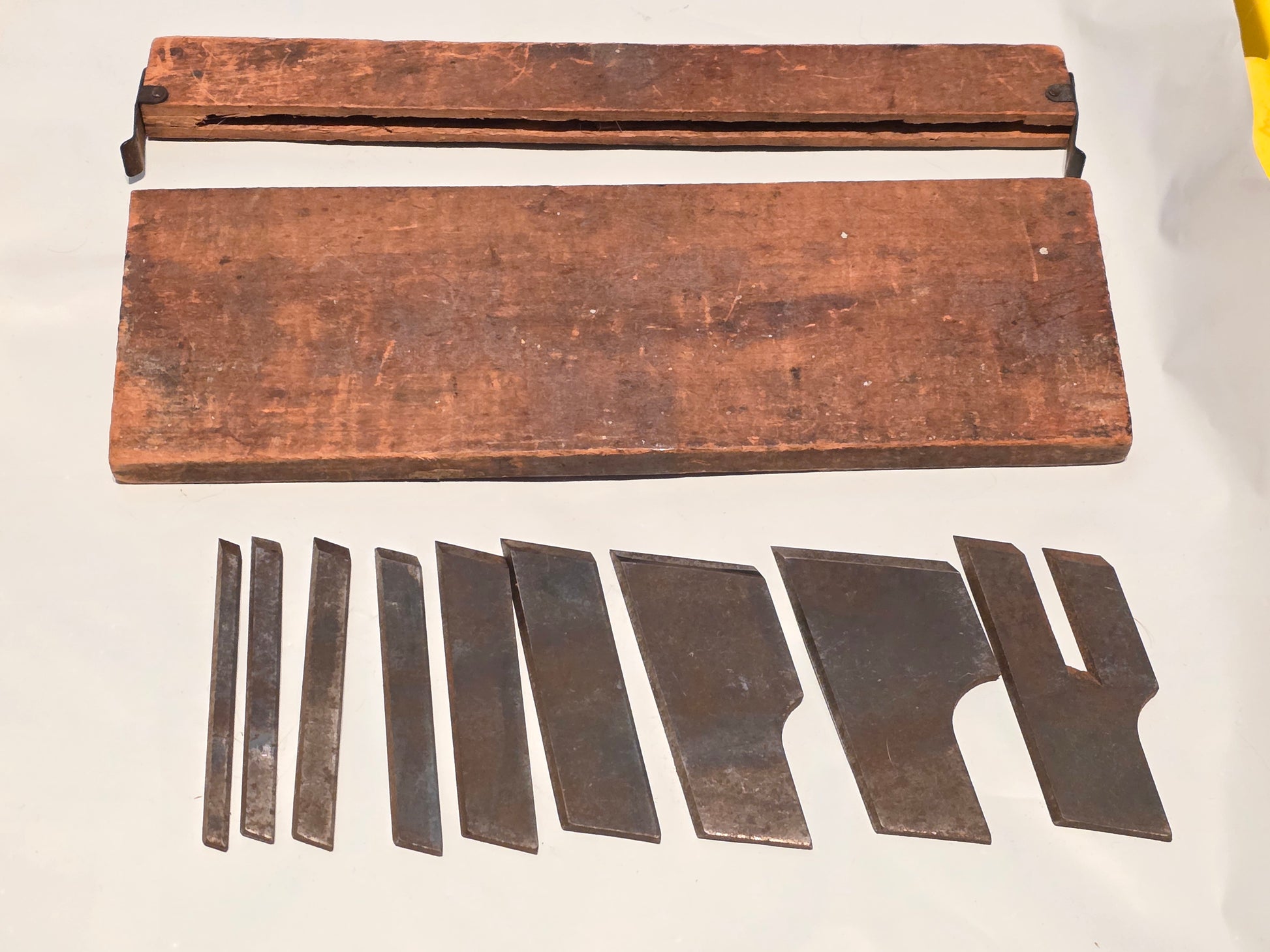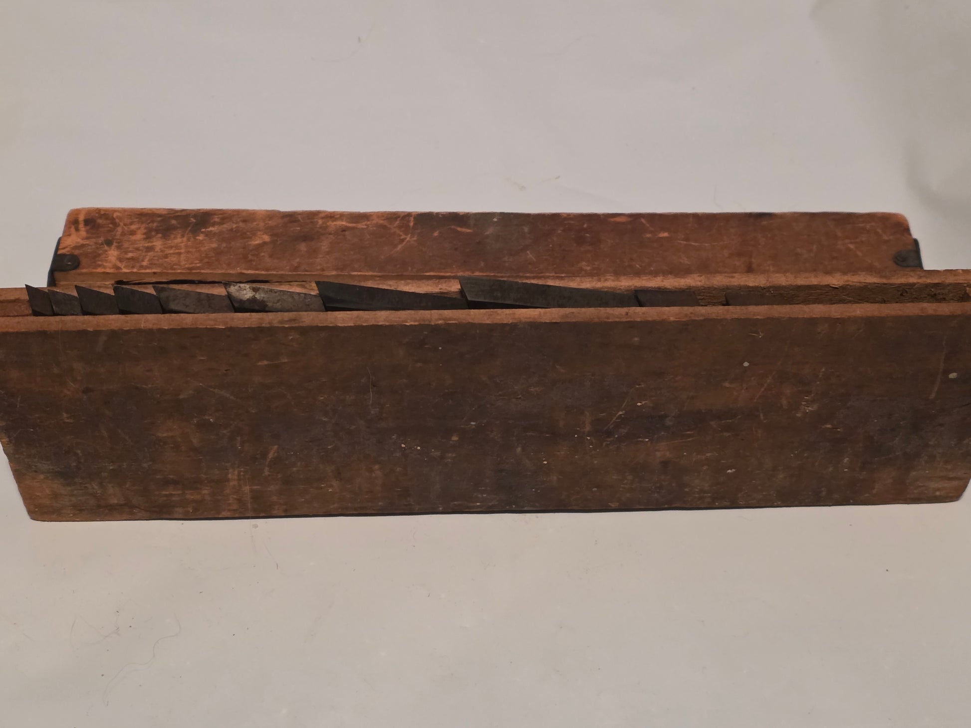 Nice set of 9 Stanley 46 skewed plan irons. Comes in a lidded box (possibly 45 or 55 box)