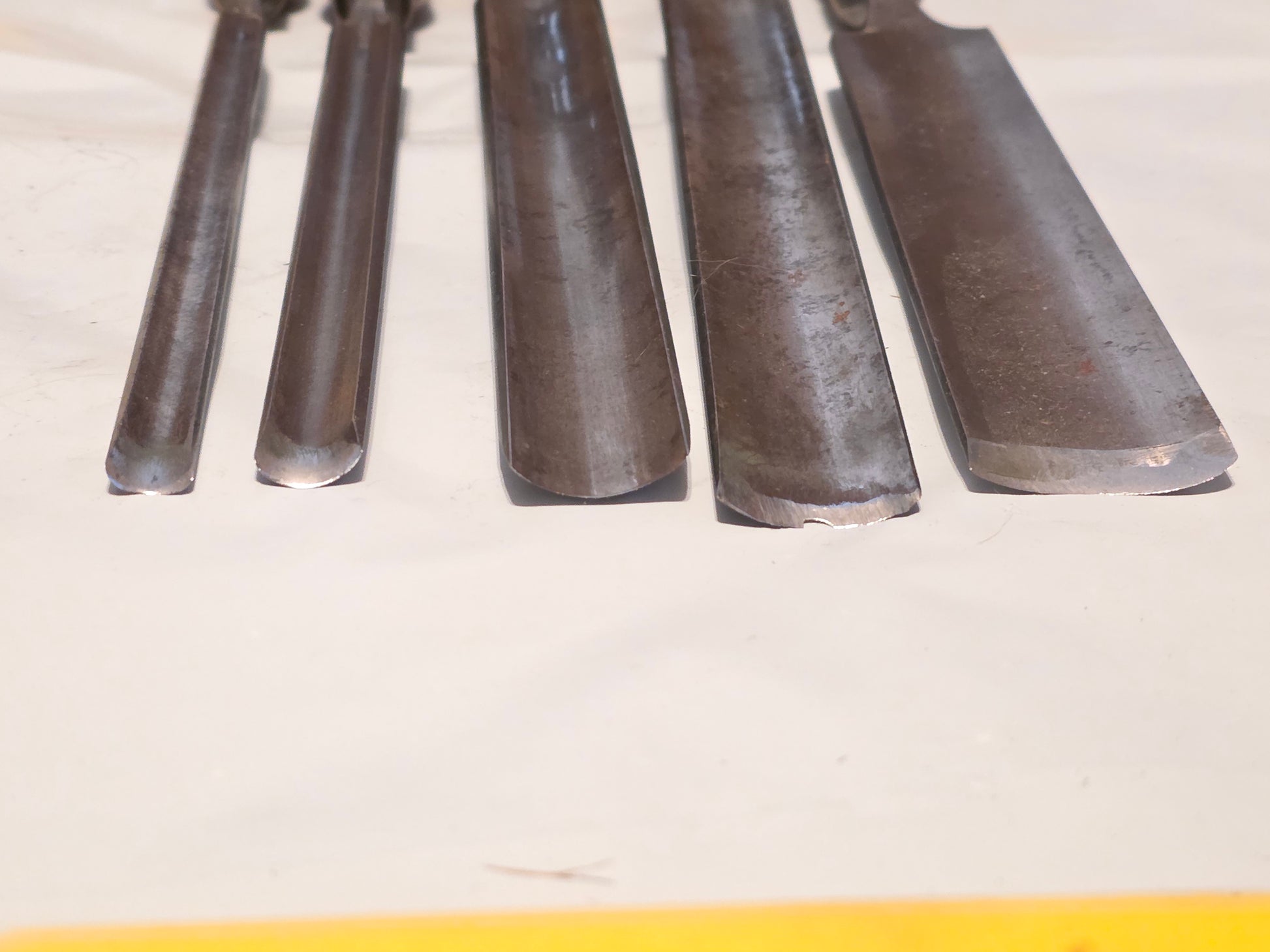 Good long shallow gouges. Needs a quick cleaning and edge touchups. Sizes are approximate and as follows. 7/16",1/2",7/8",1",1-5/16". Shortest gouge is ~13" overall. All are marked Sorby. A couple handle splits but the steel is in good shape!